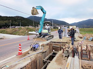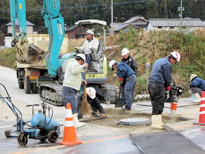 | 埋設のための溝を掘る | 大きな溜桝 | 慎重に下す、人の頭が見える |