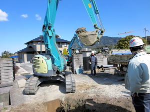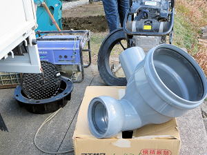 | 下水道管埋設工事 珍しいいろいろな車両が来る | ||