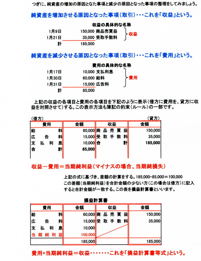 第2章第1節の取引の中で、純資産(資本)の変化をもたらさない取引(資本金の金額に変化がない)と、変化をもたらす取引がありました。ここでは、その取引の中で、
