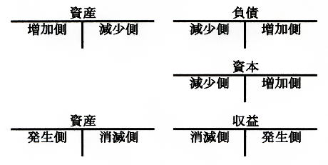 各勘定口座には、それぞれ増加を記入する側と減少を記入する側があります。簿記のルールは下記の通りです。