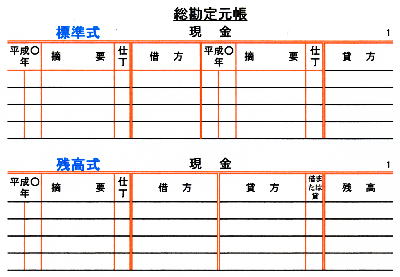 取引の仕訳の後、総勘定元帳に転記する。総勘定元帳の形式は普通、簿記の学習では下記のような略式が用いられる。また、正式な総勘定元帳は普通下記のような形式で用いられる。総勘定元帳の形式には標準式と残高式がある。残高式は転記の都度、残高の計算が必要であるが、瞬時に残高がわかるという利点がある。 |