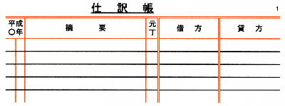 | 取引の仕訳は仕訳帳という帳簿で行う。普通、簿記の学習では下記のような略式が用いられる。また、正式な仕訳帳は普通、下記のような形式で用いられる。 |