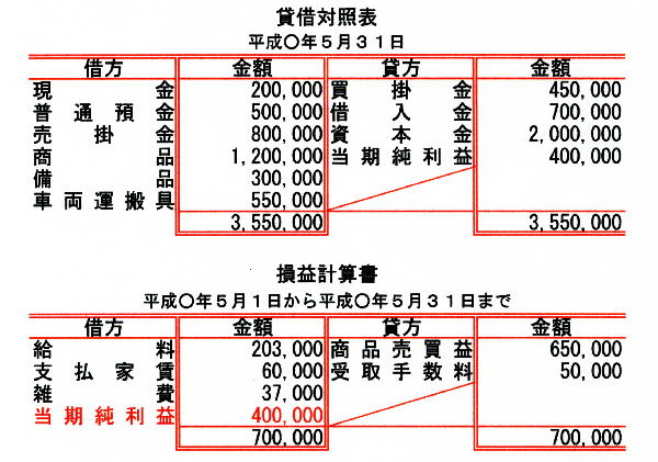 損益計算書や貸借対照表などの財務諸表を作成する問題は、上記のように各勘定科目とそれに対応する残高を羅列する形の出題と、総勘定元帳をそのままの形で出題する方法などがある。いづれにしても、どれが資産か、負債か、資本か、またどれが収益か、費用かを正しく区別できることが大切です。当期純利益(当期純損失の場合もある)は、貸借対照表からも損益計算書からも求まる(当然のことながら、同額の)ことをきちんと知っておけば、これが解答への一つのヒントになります。 |