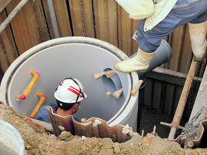 | 埋設のための溝を掘る | 大きな溜桝 | 慎重に下す、人の頭が見える |