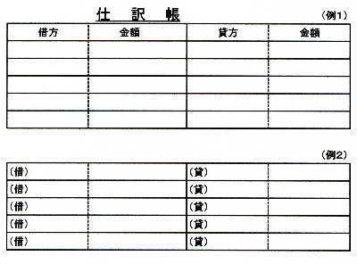 | 取引の仕訳は仕訳帳という帳簿で行う。普通、簿記の学習では下記のような略式が用いられる。また、正式な仕訳帳は普通、下記のような形式で用いられる。 |